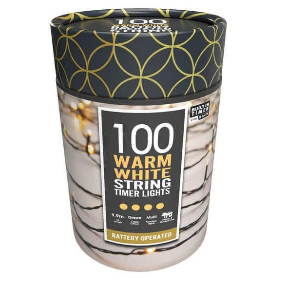 battery operated timer string lights - 100 warm white led bulbs - lead length 0.3m - bulb spacing 100mm - requires 3aa batteries (not included) - bulb rating 3v/0.02a/0.06w - indoor / outdoor - 8 function