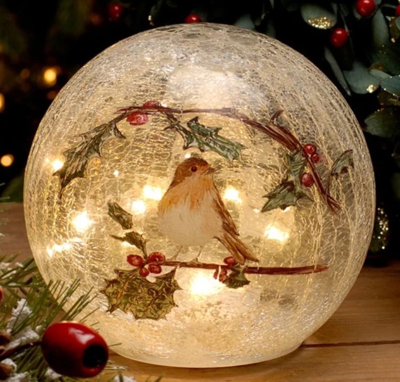 20cm Battery Operated Lit Crackle Effect Robin Design Glass Ball