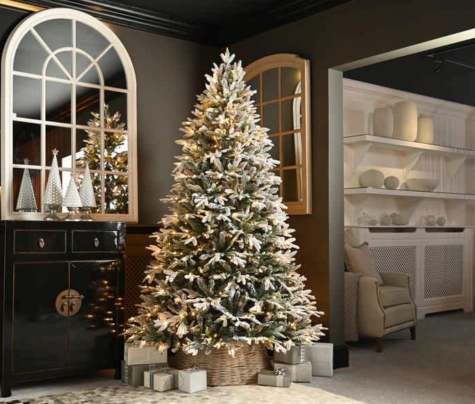 240cm prelit deluxe grays peak flocked pine tree - pe and pvc mixed tip - hinged branches - 2291 tips - girth 150cm - metal stand - 790 warm white led - transformer rating ip20/31v/7.2va with 8 functions