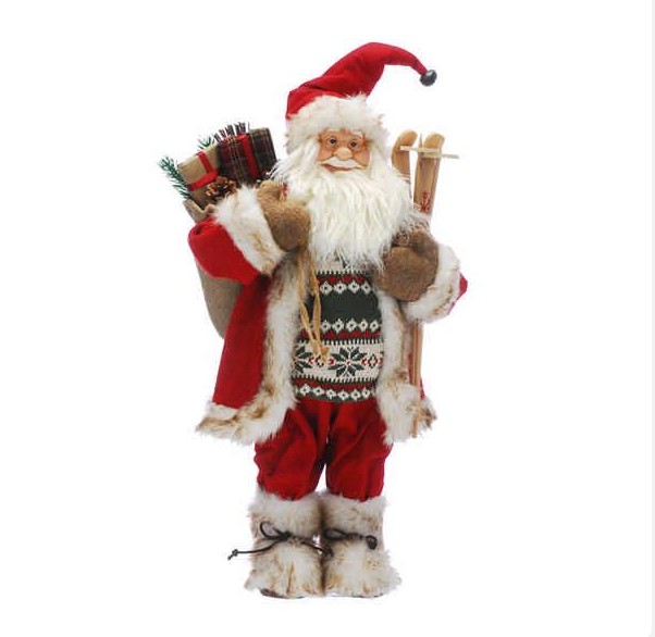 60cm standing santa with a red coat and grey fur boots and a fair isle jumper holding skis and a hessian sack of presents