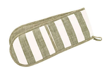 A padded double oven glove in 100% wide stripe in olive. Finished with bound edges and a useful hanging loop and lined in chambray olive. Size: 18x94cm